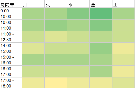 - 色が薄いマス(黄色に近い)は、比較的スムーズにご案内できる傾向にあります。